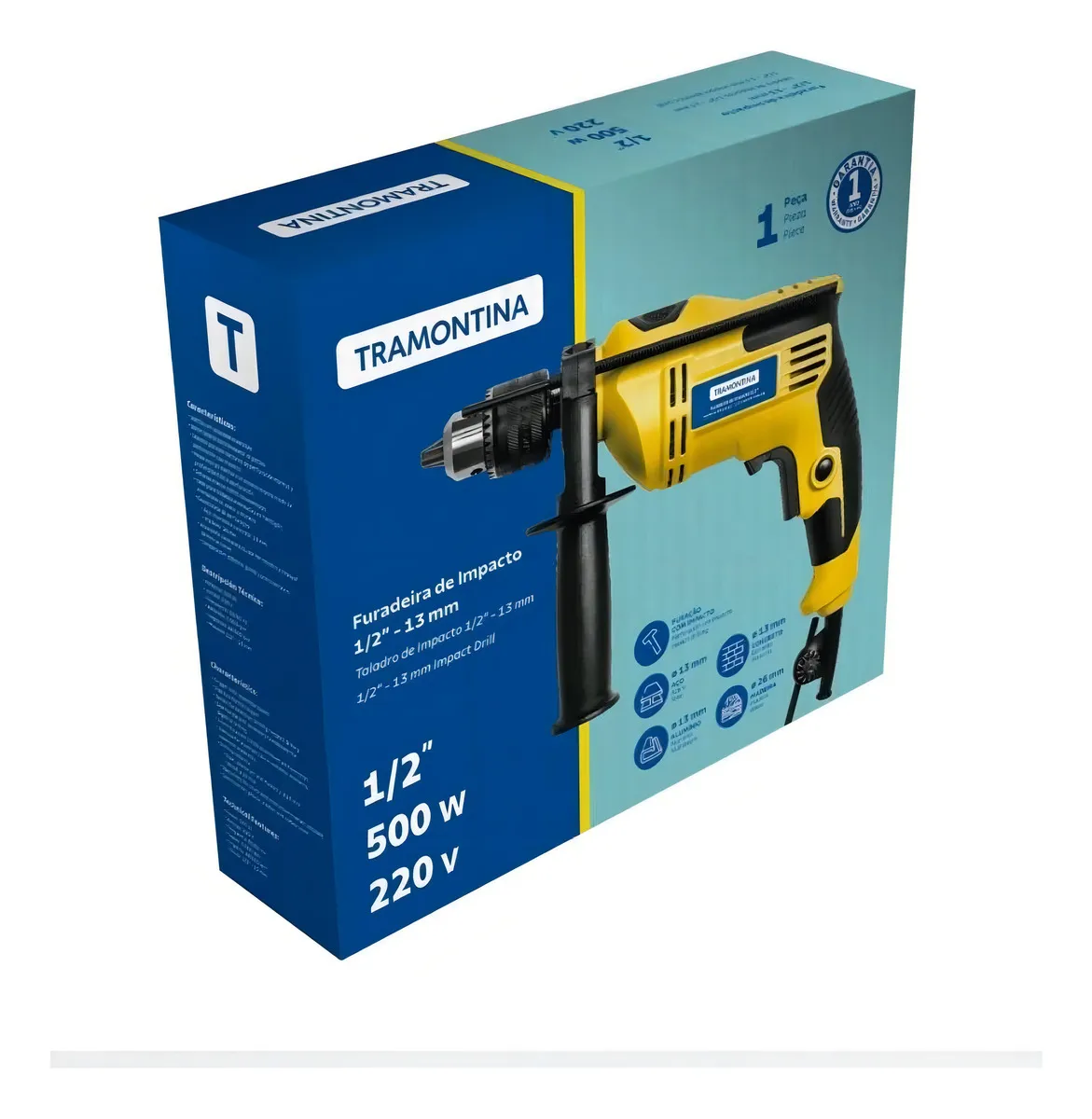 CARACTERÍSTICAS * Potência: 500 W. * Frequência: 50/60 Hz. * Mandril de 1/2" - 13 mm. * Rotação: 0-2900 min-1 / rpm. * Corpo e botões injetados. * Cabo elétrico de 2 m. * Gatilho com potenciômetro para variação de velocidade. * Botão lateral para o travamento do gatilho. * Acompanha chave para aperto do mandril. * Acompanha manual de instruções. * Seletor de operação: furação normal / furação com impacto. * Cabo auxiliar com acessório para medir profundidade da furação. * Excelente desempenho em operações de perfuração. * Ideal para trabalhos em concreto, alvenaria, aço e madeira. * Botão com reversão e variação de velocidade, propiciando um maior conforto e praticidade durante a operação. * Trava lateral para quando a ferramenta for utilizada em trabalhos contínuos. * Empunhadura lateral para maior conforto e segurança. * As ferramentas são produzidas e testadas conforme normas específicas.